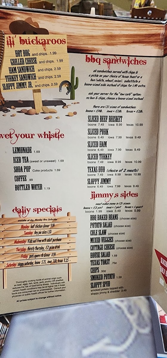 Welcome to Jimmy's Barbeque Pit, a true gem located at 717 Story St, Boone, Iowa. This charming establishment is more than just a restaurant; it's a celebration of authentic barbecue culture. With a warm, cowboy-themed decor that evokes the spirit of the wild west, Jimmy's offers not just a meal, but an experience.